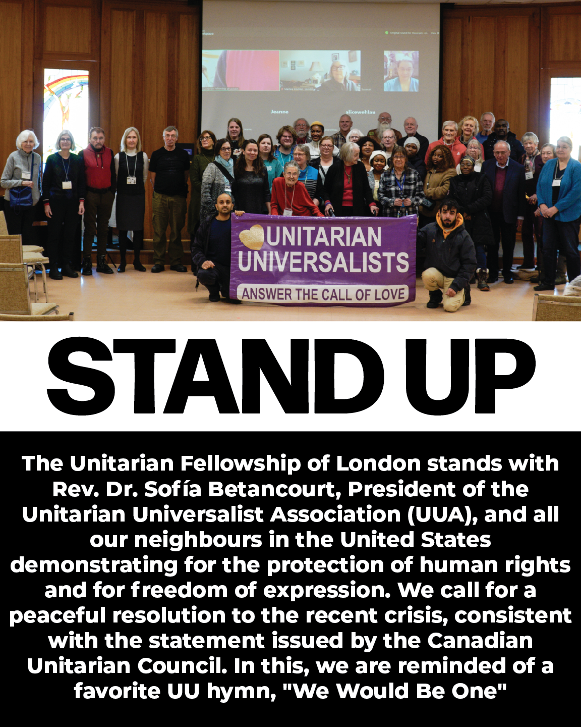 The Unitarian Fellowship of London stands with Rev. Dr. Sofía Betancourt, President of the Unitarian Universalist Association (UUA), and all our neighbours in the United States demonstrating for the protection of human rights and for freedom of expression. We call for a peaceful resolution to the recent crisis, consistent with the statement issued by the Canadian Unitarian Council: https://cuc.ca/project/rev-dr-sofia-betancourt-arrested-during-protest/ . In this, we are reminded of a favorite UU hymn, “We Would Be One”: https://www.youtube.com/watch?v=IMn0QdiTzQM
